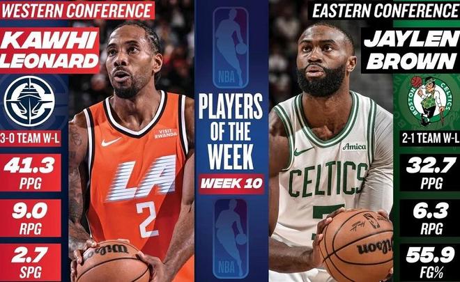 NBA官方公布了第11周的东西部周最佳球员,东部由绿军前锋布朗当选,西部由快船前锋小卡当选。布朗上周场均轰下32.4分+6.3篮板+3.3助攻,带领绿军取得2胜1负的战绩。据统计,这是布朗本赛季第2次当选周最佳球员,也是生涯第6次获此殊荣。小卡上周场均豪取41.3分+9篮板+2.7抢断,带领快船取得3胜0负的战绩。据统计,这是小卡快船生涯第5次当选周最佳球员,也是快船生涯第5次拿到该奖项。除此之外,鲍尔、巴恩斯、康宁汉姆、基迪、小波特、唐斯、杜兰特、乔治、亚历山大和约基奇等球星获得了周最佳提名。