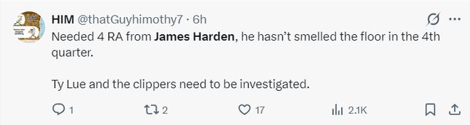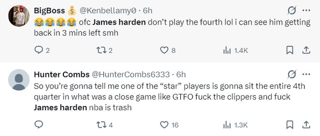 6.哈登在第四节没有登场,这实在是太荒谬了,这种行为不该被允许,我真的要FXXK。